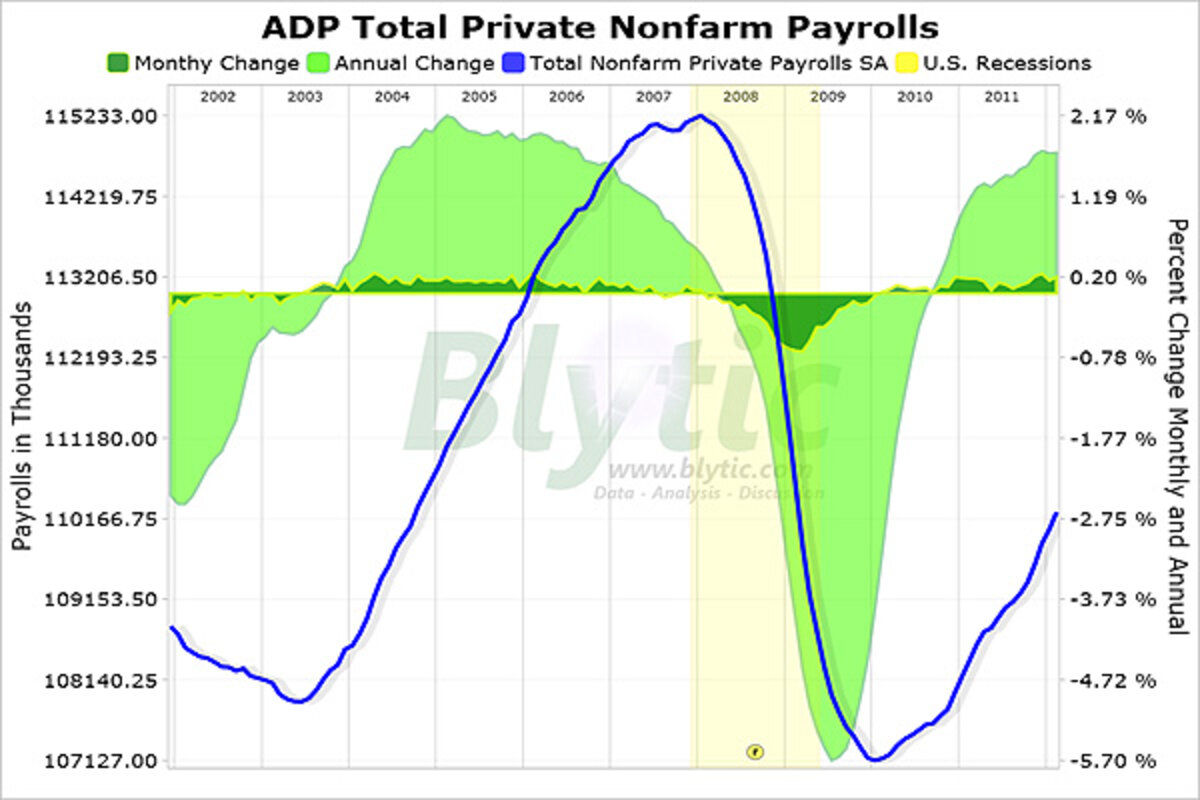 With today's report, ADP revised back data for 2010 and 2011 showing that the recovery has been fairly consistent with a few spotty periods of sluggishness while more recently, the trend had been picking up momentum.