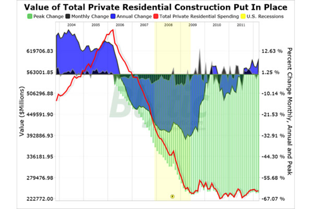 On a month-to-month basis, total residential spending increased a slight 0.68% from February and rose 7.42% above the level seen in March 2011 while remaining a whopping 63.91% below the peak level seen in 2006.