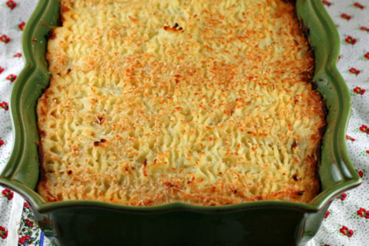 Scoop the meat filling into an 11-by-7-inch baking dish and spread out to make a smooth top. Dollop the mashed potatoes over the filling, then spread out to cover the meat. Using slightly damp fingers is a good way to do this. Try not to let the meat or sauce poke through the potato topping. Use a fork to scrape light lines across the smooth top of the potatoes. This will give a lovely browned crispy effect. Sprinkle the Parmesan over the top.