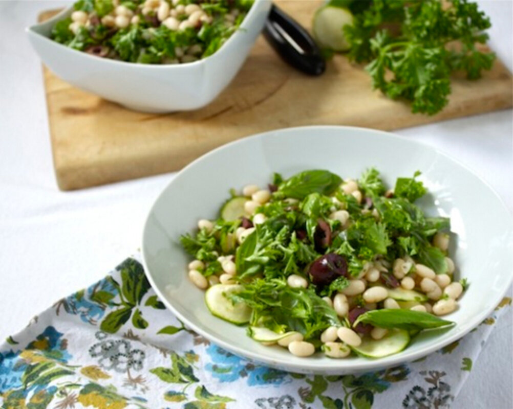 The first time I served this salad it was on a bed of thinly sliced zucchini (I used a carrot peeler, but for more than 1 person a mandoline would be faster) drizzled in olive oil and a squeeze of lemon juice and fresh ground pepper. Today I enjoyed it on a bed of freshly picked spinach from the garden toasted in a Tuscan Herbed Olive Oil and Sicilian Lemon White Balsamic (thanks Tina for the lovely present). Or try it on sliced tomatoes or with steamed green beans even. And if you’re into bread, it would make an exceptional topping of toasted sourdough as an appetizer…