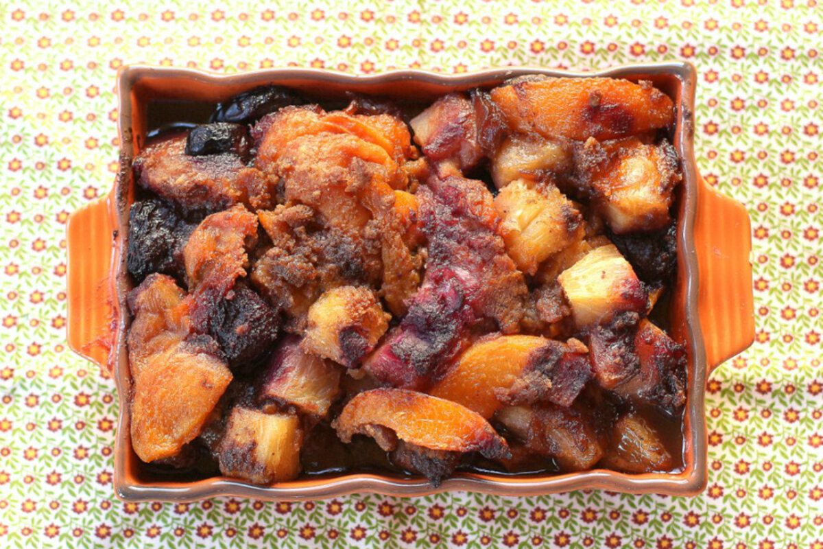 1. Drain the pineapple, peaches pears and apricots. Spread the fruit in a greased 9- by 13-inch baking dish. Drain and rinse the cherries (do not drain the with the other fruit, the juice will stain). Lightly toss the fruit with the cornstarch and the cookie crumbs. I find my good clean hands to be the best tool for this. Arrange the cherries amongst the fruit.