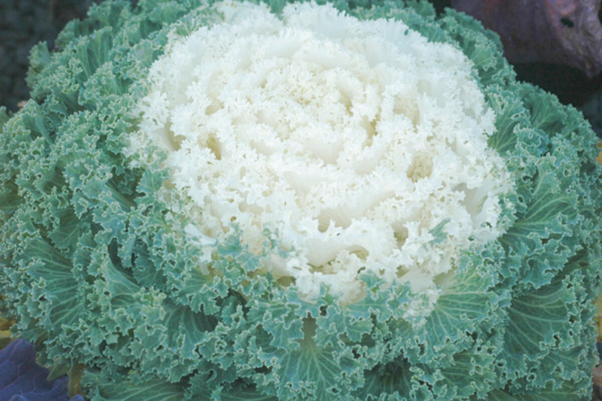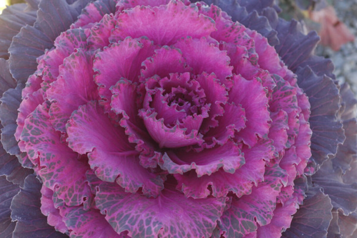 The bloom, of course, is not a flower but foliage -- a rosette of central leaves that lose their chlorophyll as the mercury drops, changing from green to white, pink, purple, and near-red.