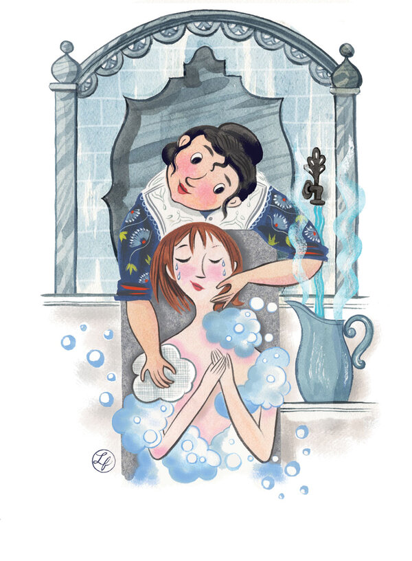 I’d never been so scrubbed in my life – every inch, every finger and toe. Once my back was done, Anne motioned for me to sit up. Here came the bucket again, right over my head! I didn’t have time to hold my breath. I sputtered. Undeterred, Anne sudsed my head, my face, my ears, and – whoosh! Again with the bucket.