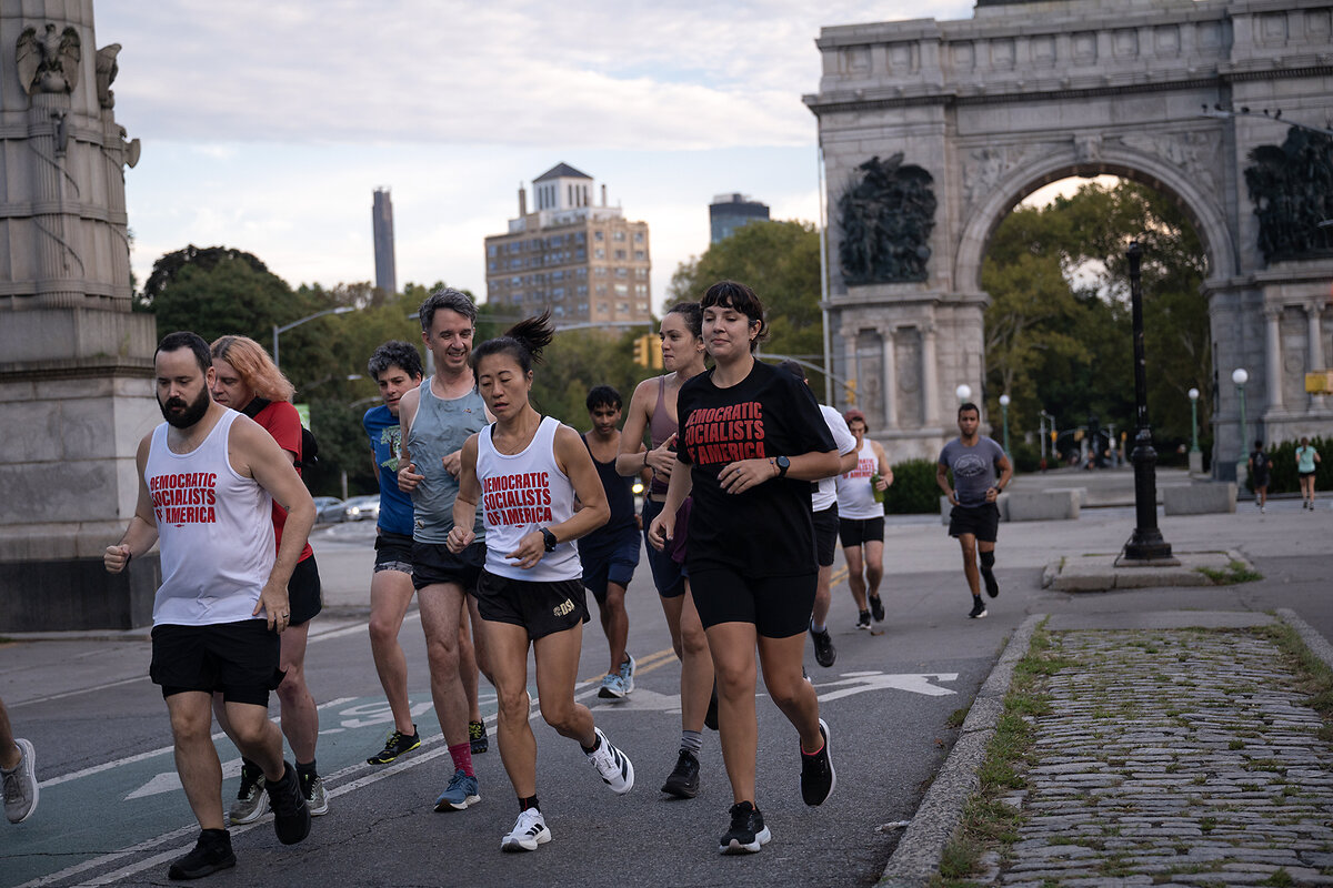On this unusually warm September morning, the sky is on my side. I meet the runners under a peach-skin dawn in Prospect Park, Brooklyn’s big backyard. I’m here to photograph the running club of the New York City chapter of the Democratic Socialists of America, and those runners are easy to spot in their DSA T-shirts. But the large camera swinging at my side is a dead giveaway, so they find me first.