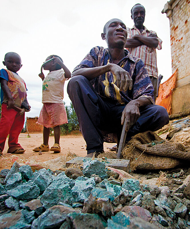 Far away on the outskirts of a mining town called Kolwezi, men, women, and often children spend their days digging with picks and shovels for bits of copper ore. Each week they push bicycles and wheelbarrows laden with bags of those rocks to sell to the Chinese.
