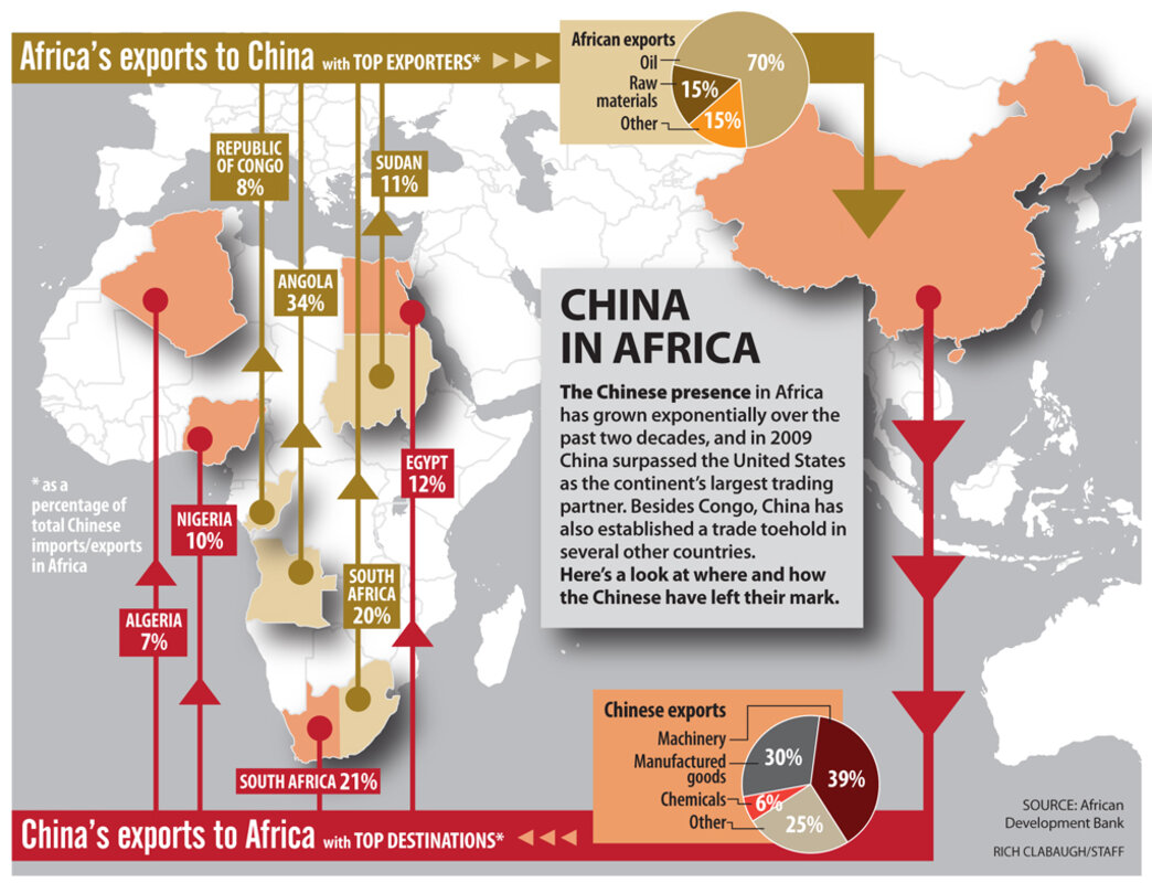 The Chinese are replicating this minerals-for-infrastructure model in other African countries, notably Zimbabwe, Guinea, and Angola. In 2009, China surpassed the United States as Africa's largest trading partner.