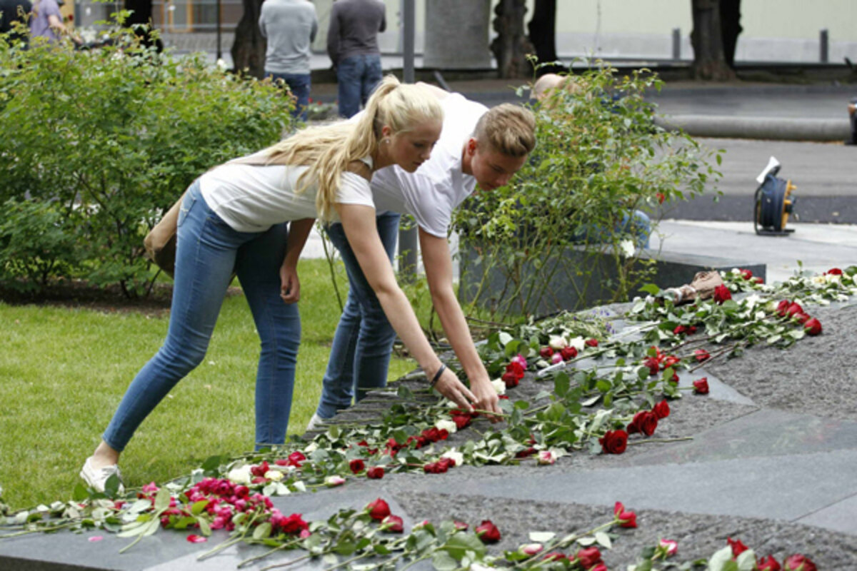 “My message is that fundamentally Norway is the same kind of [open and democratic] society,” said Jens Stoltenberg, Norway’s prime minister, in an interview with The Christian Science Monitor shortly after laying a memorial wreath in the government square behind his bombed out offices. One year later, those offices remain draped in plastic tarp and the windows are boarded up.